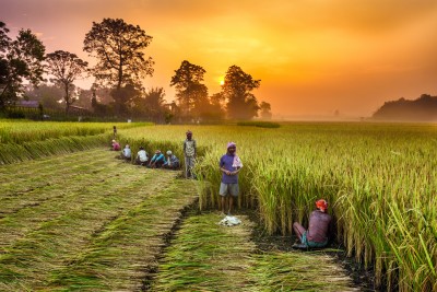 L’eau a été évacuée de la rizière une à deux semaines auparavant afin de faciliter la récolte. Le riz est récolté en le fauchant avec sa paille ou en coupant seulement les panicules. Le riz est alors battu. Cette opération s’effectue en Asie à la main, en frappant les panicules sur des fûts, ou en utilisant des petites batteuses !