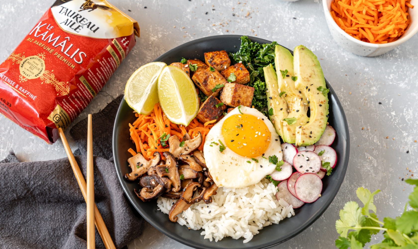 Dresser le bol avec le riz, les légumes, tofu, œuf et l’avocat coupé en lamelles et saupoudrer de graines de sésames.