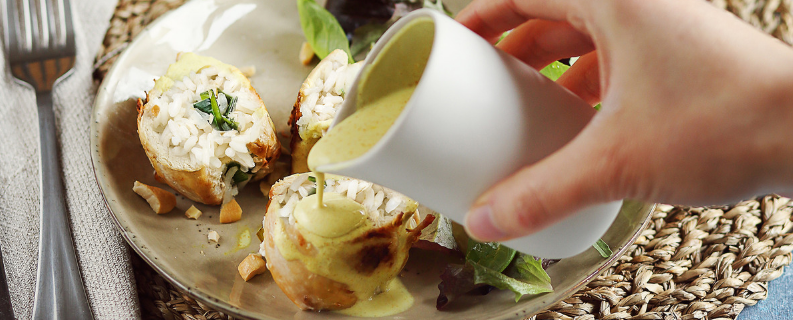 Taureau AiléNos idées recettesD'ici et d'ailleursBlanc de poulet farci au riz thaï et poireau sauce curry coco