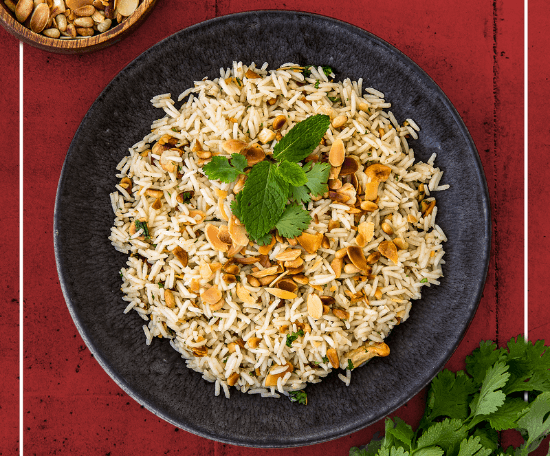 Hacher finement l’oignon puis le faire revenir doucement dans une casserole haute avec le beurre. Ajouter les épices, cuire encore 3min, puis ajouter le riz basmati Taureau Ailé. Faire revenir jusqu’à ce qu’il soit nacré.