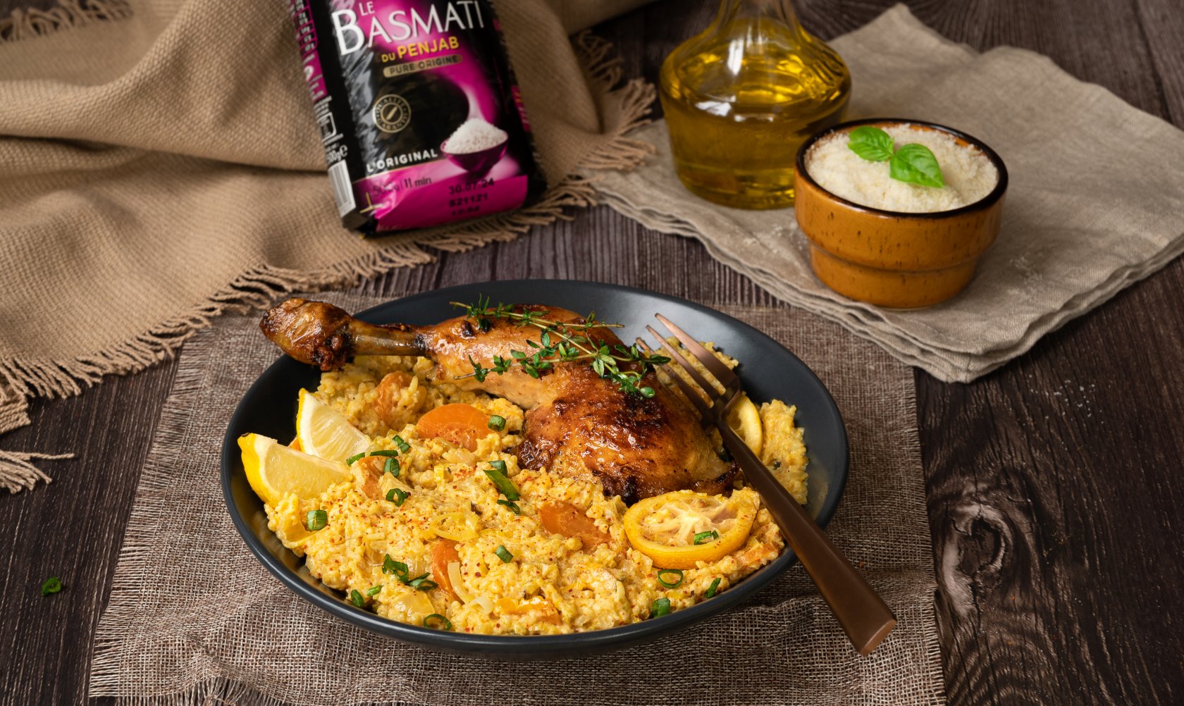 Répartir le riz uniformément dans le fond de la casserole avant de placer les cuisses de poulet dessus. Disposer le citron coupé en rondelles tout autour.