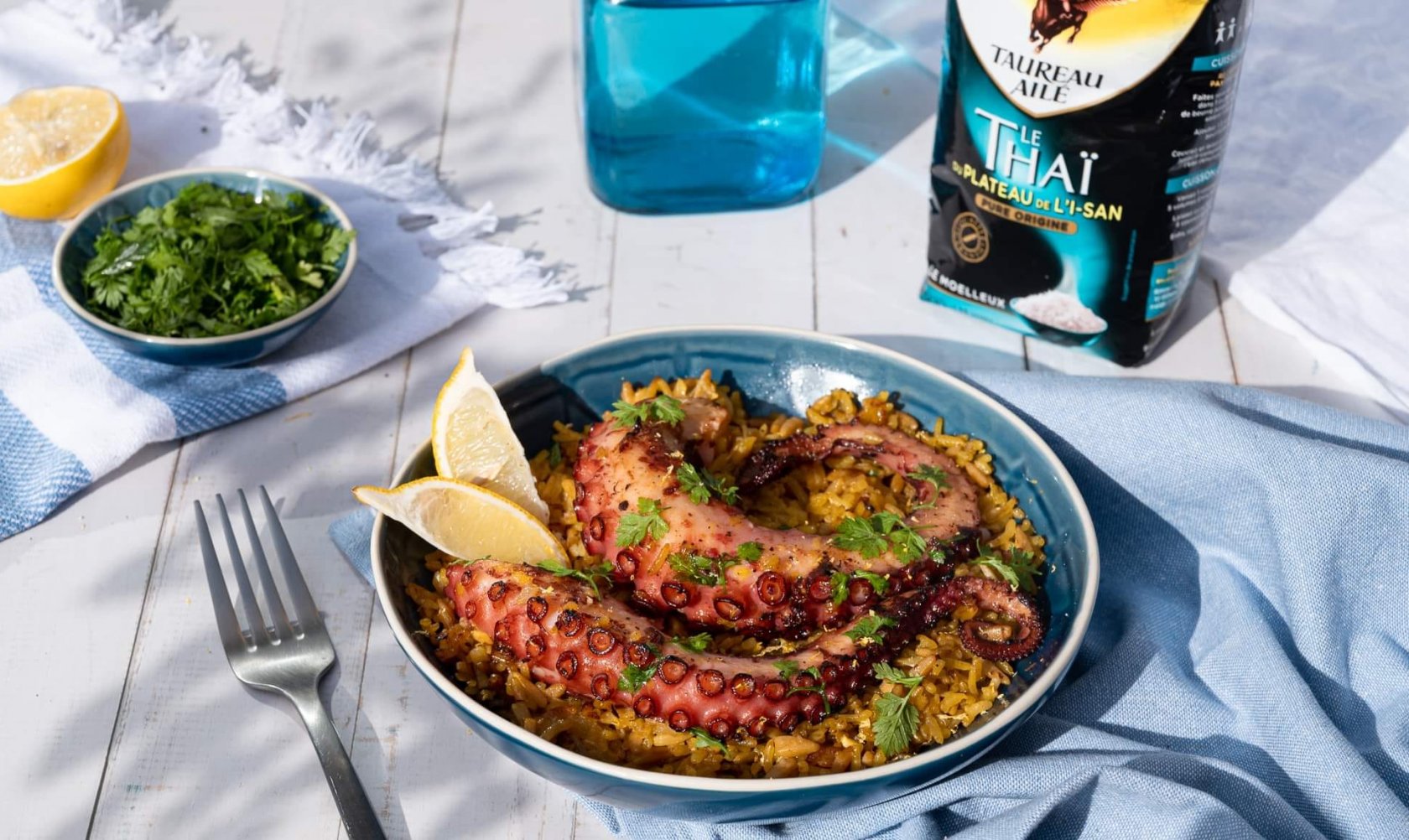 Sans tarder, servir le riz puis le poulpe grillé dessus et parsemer de zeste de citron, persil et aneth fraîchement ciselés.