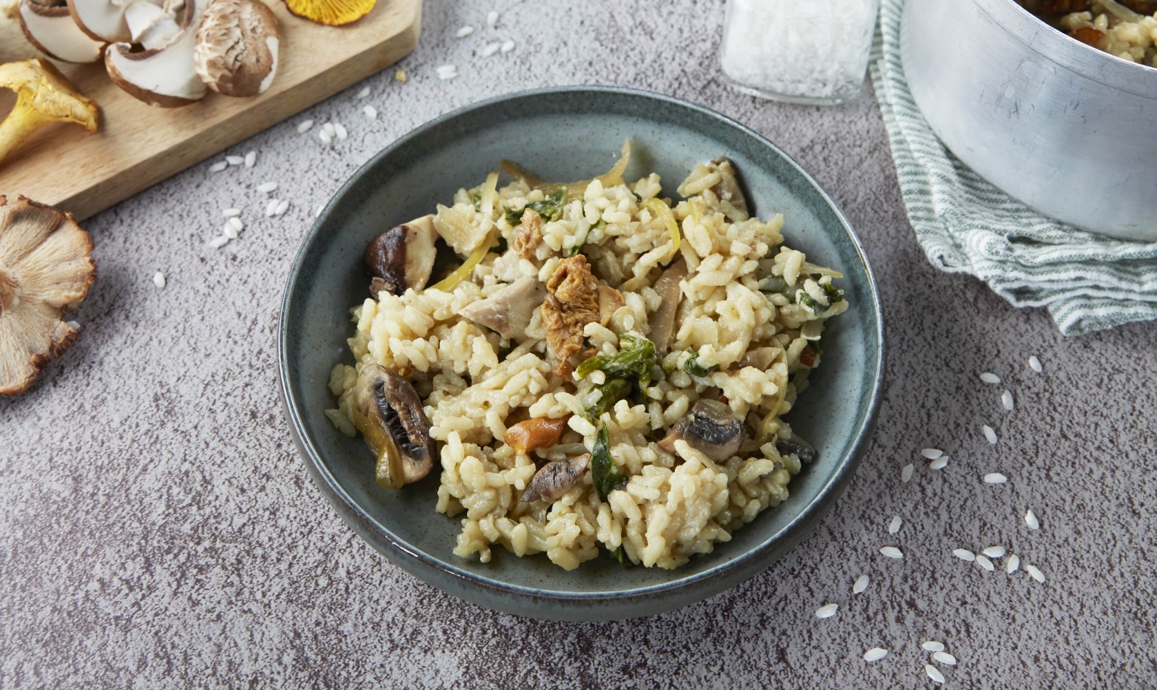 Faites chauffer un filet d’huile d’olive dans une sauteuse. Déposez l’oignon haché, mélangez puis ajoutez les champignons et laissez cuire environ 5 min.