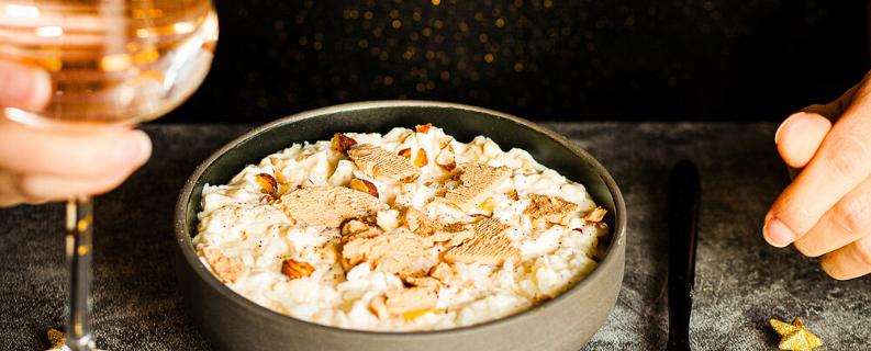 Lorsque le riz est cuit, retirez du feu et ajoutez la crème liquide et les noisettes. Poivrez légèrement et mélangez. Servez puis ajoutez des éclats de foie gras et dégustez sans attendre.