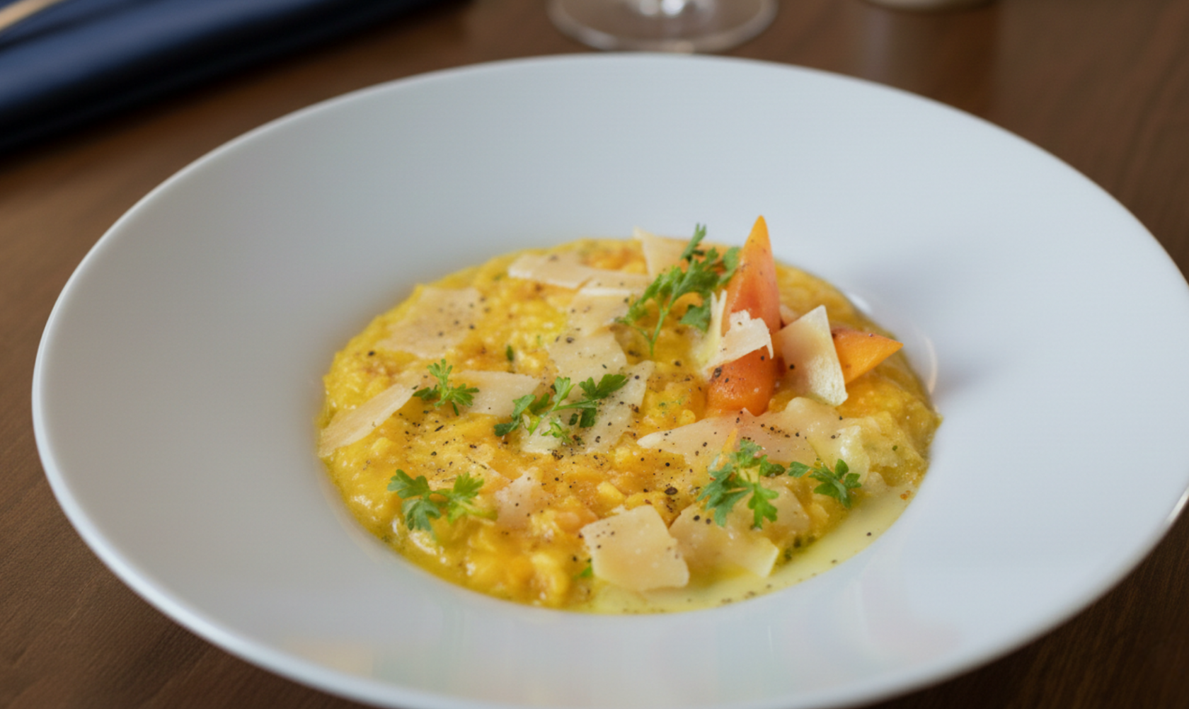 Dresser avec quelques copeaux de Beaufort, des herbes fraîches, un peu de poivre du moulin et des quartiers de potimarrons rôtis.
