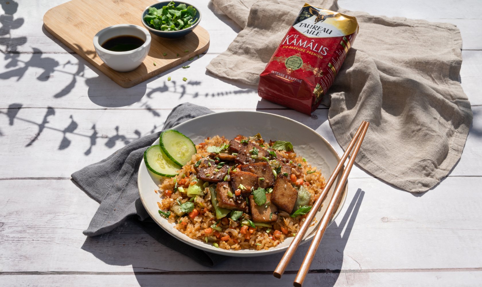 Sinon, utiliser un reste de riz cuit en trop, en ajustant les proportions de cette recette.Le jour même, couper le tofu en tranches de 3 mm d’épaisseur. Laver puis couper les haricots et les carottes.