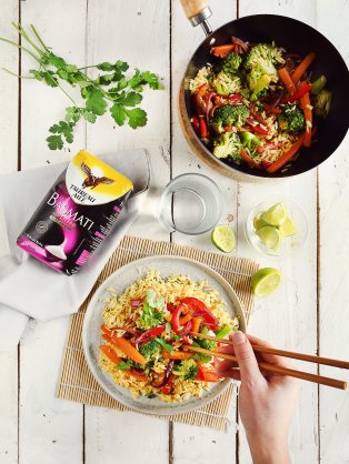 La veille (idéalement) cuire le riz comme indiqué sur le paquet. Le laisser refroidir complètement puis le placer au réfrigérateur jusqu’au lendemain.