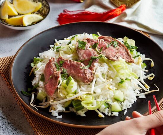Servez dans les assiettes, ajoutez par-dessus les tranches de bœuf et un peu de menthe.