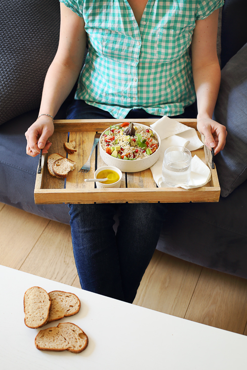 Mélangez le riz, l’avocat, les tomates et les graines de grenade. Ajoutez quelques feuilles de mesclun.