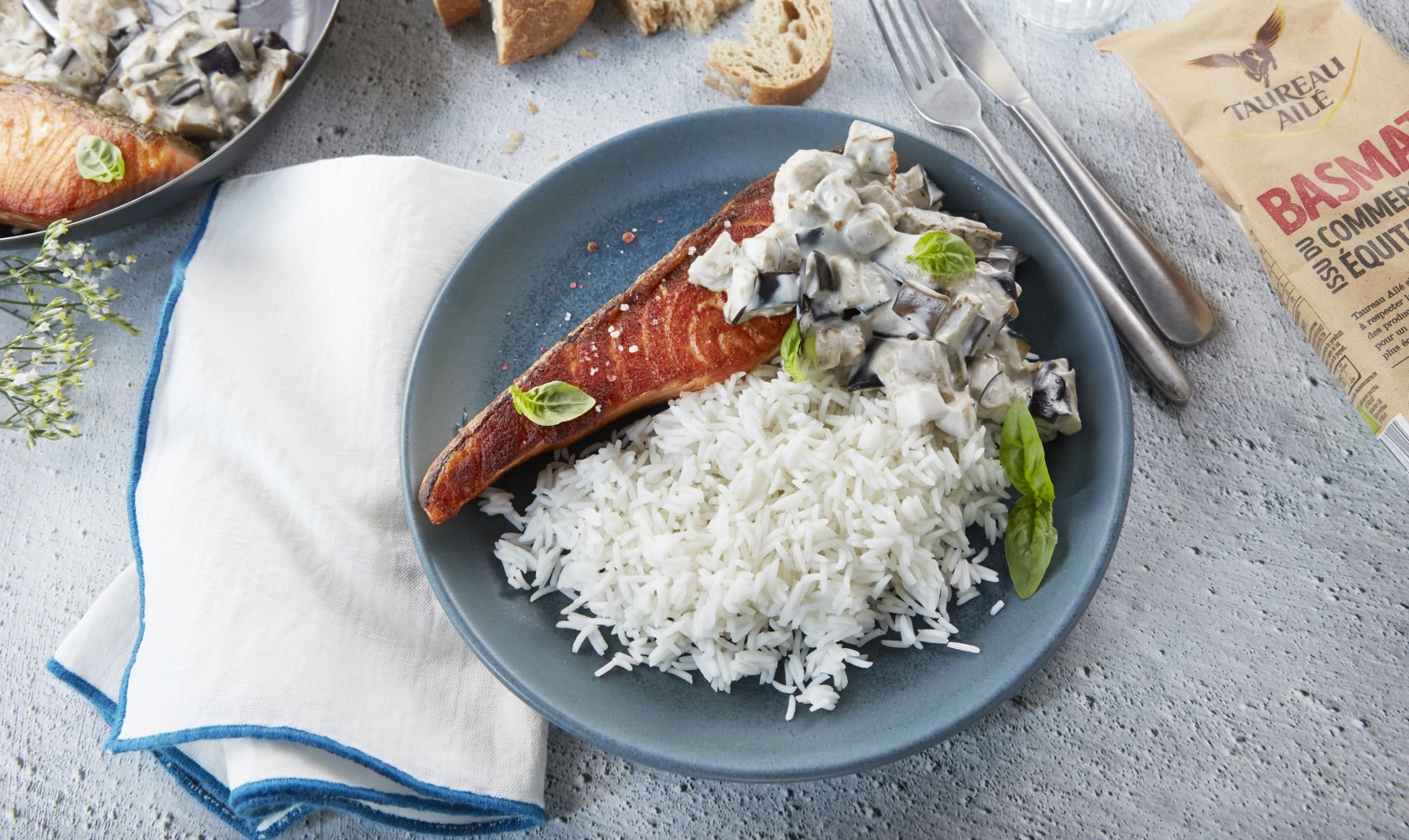 Servez le riz à l’assiette, puis le saumon avec l’aubergine et le reste de sauce coco. Ajoutez ensuite le sel sur le saumon et quelques feuilles de basilic (haché ou non) dans chaque assiette, c’est prêt !